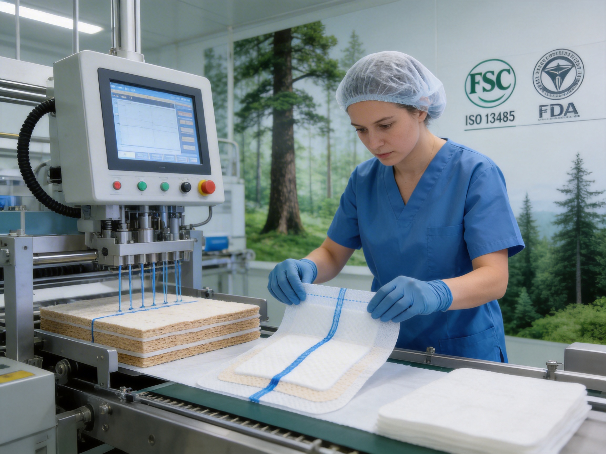 The wood pulp used in the pad is sourced from sustainably managed forests certified by the Forest Stewardship Council (FSC). This ensures that the raw material is environmentally responsible and free from harmful contaminants. The non-woven fabric is made from medical-grade polypropylene, which is tested for purity and hypoallergenicity before use. All raw materials are subject to incoming quality control (IQC) checks, including purity testing, absorbency testing, and chemical analysis.
